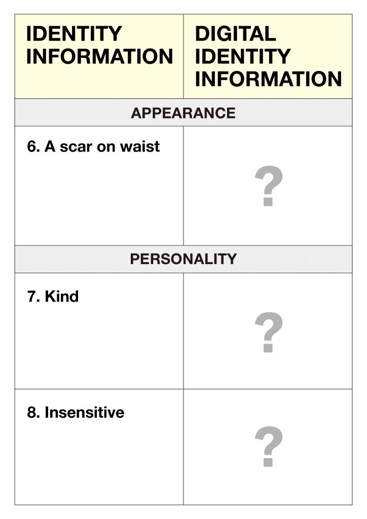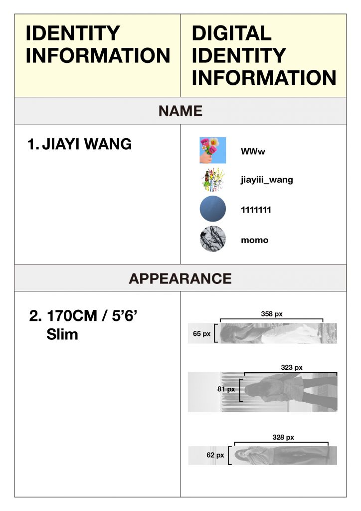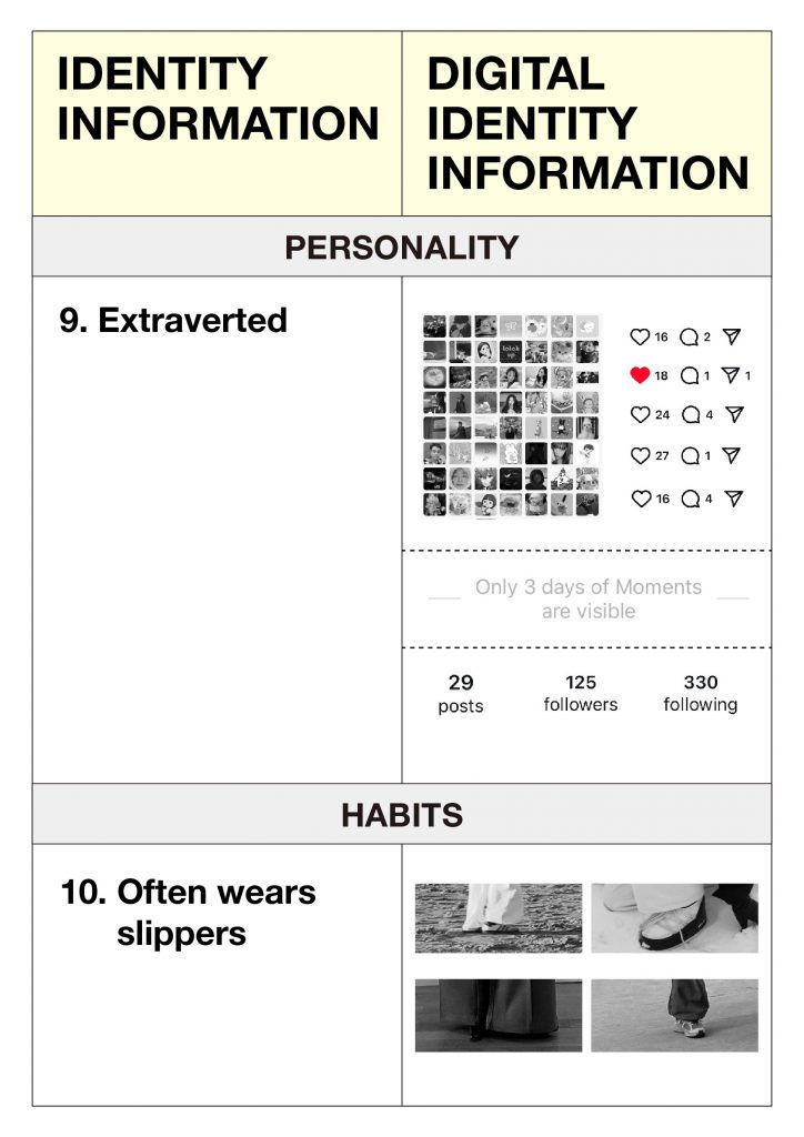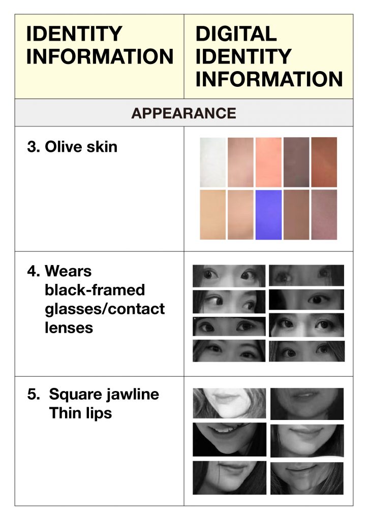 And in my project, I created a table to map real-life descriptions against my digital fragments,my online persona. By juxtaposing these real-life descriptions with how I present myself on social media, I could identify areas of alignment and disparity. For instance, while my friends and family described me as someone who wears black-framed glasses, I realized I have never posted a photo of myself wearing glasses on social media. And they described me as some with square jawline, but on the photos i posted online, I always photoshop it to make it not that square.
