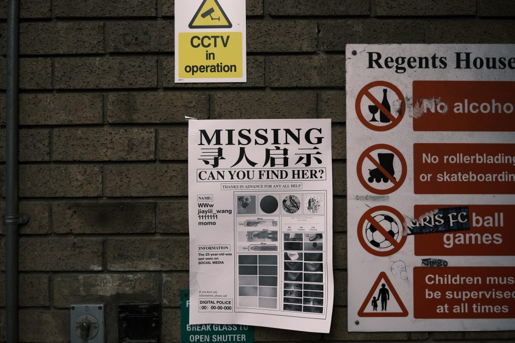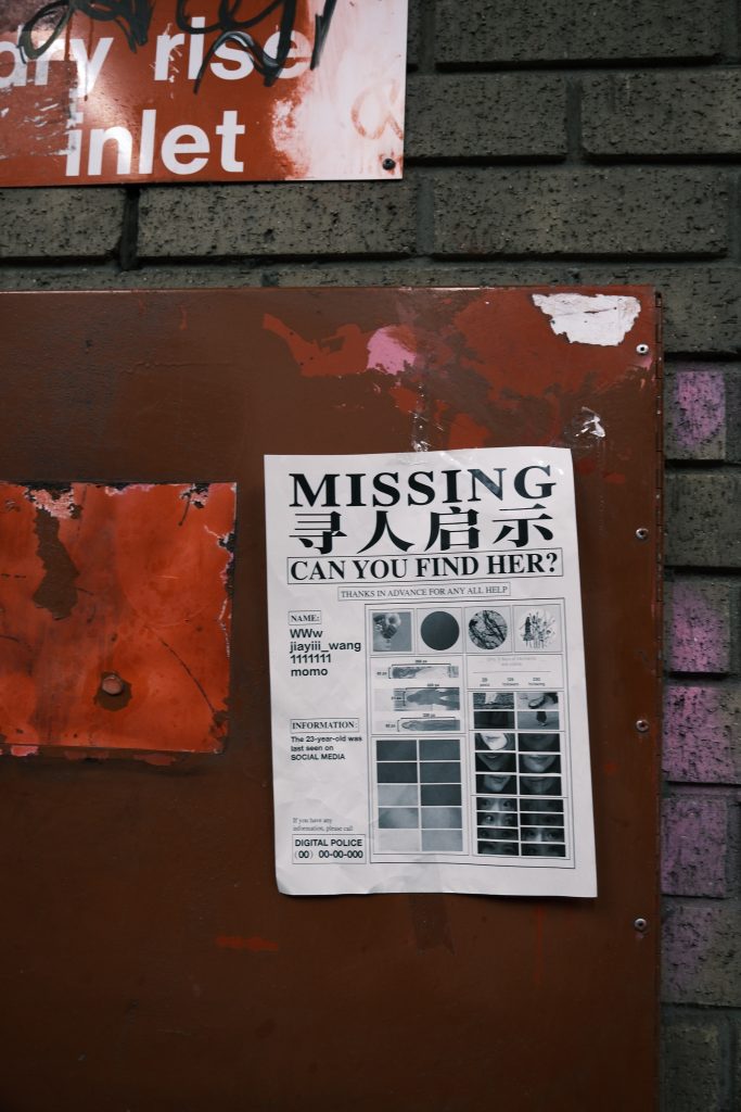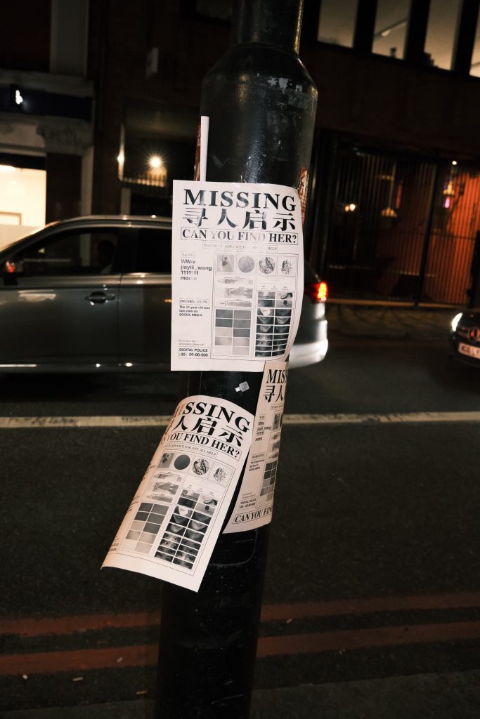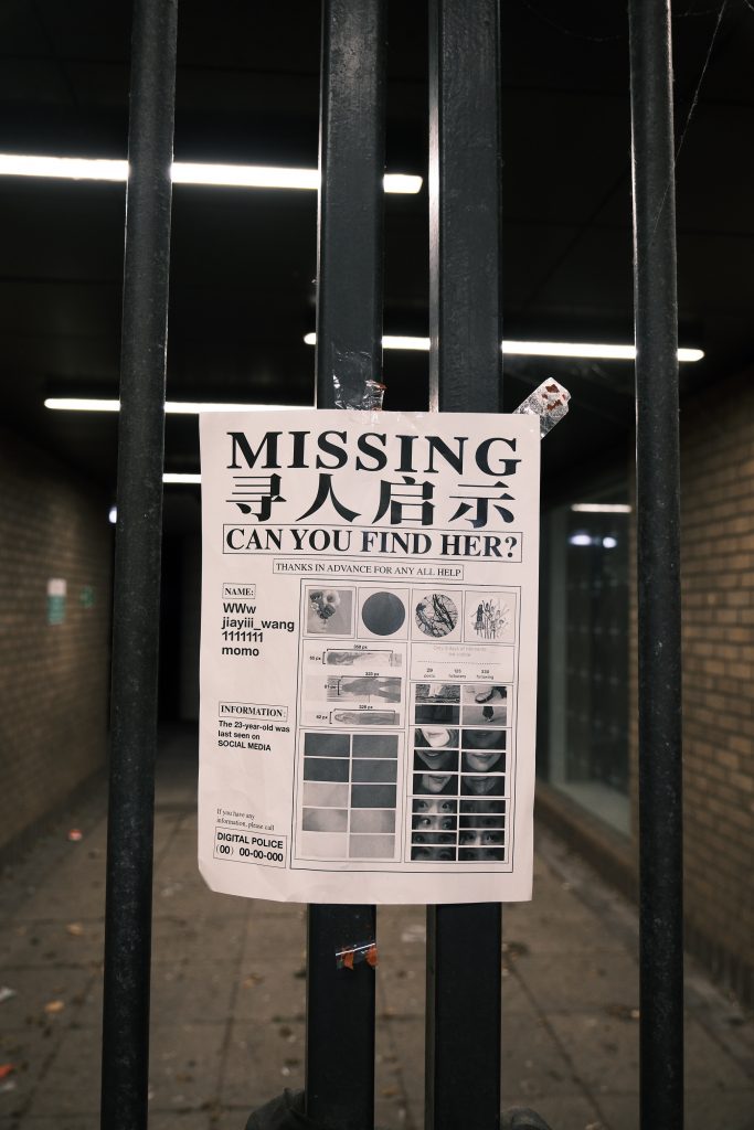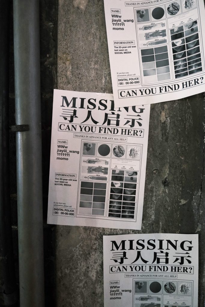 This “missing person notice” represents my virtual identity, which, of course, cannot be located in real life, just as my real identity cannot be found through this notice. This dual absence leads me to ask: Who am I? And where do I exist?
